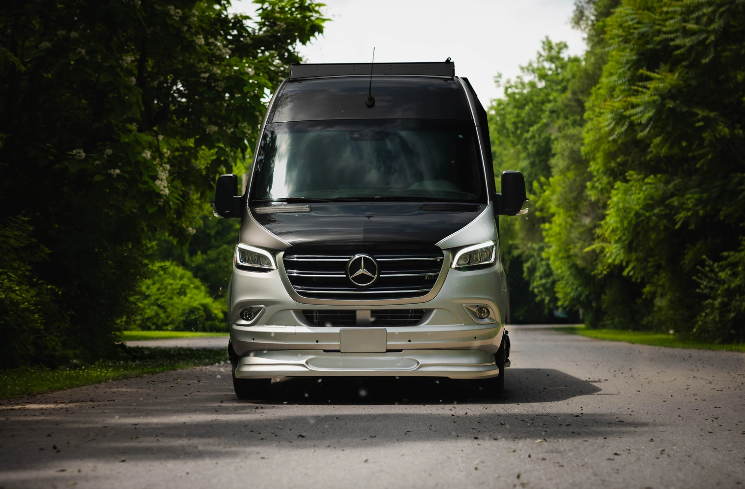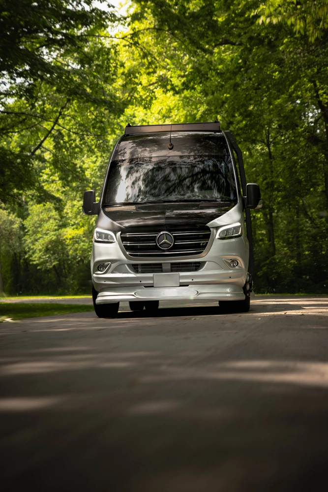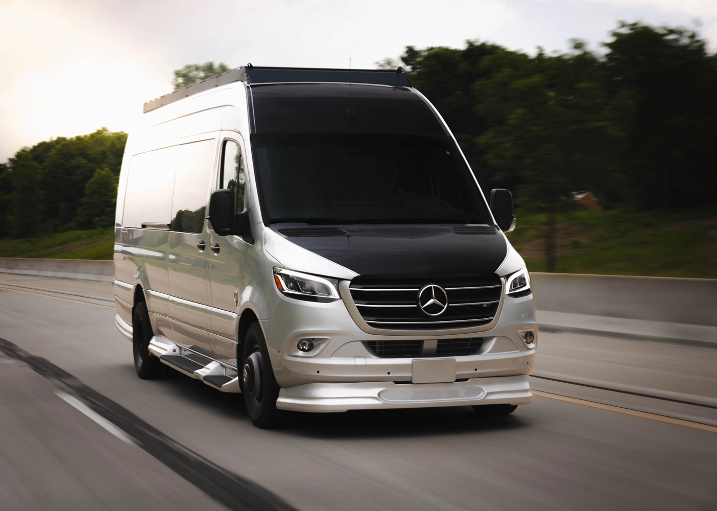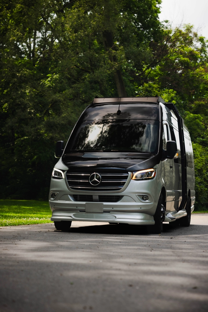 The 10OB delivers group comfort with a sophisticated 10-passenger layout featuring six handcrafted captain’s chairs, 44" opposing bench seats, and a spacious 32" rear half bath. Purpose-built for refined road experiences, it includes a sink, microwave, advanced climate control, superior sound insulation, state-of-the-art entertainment, and sleek custom full-body paint.