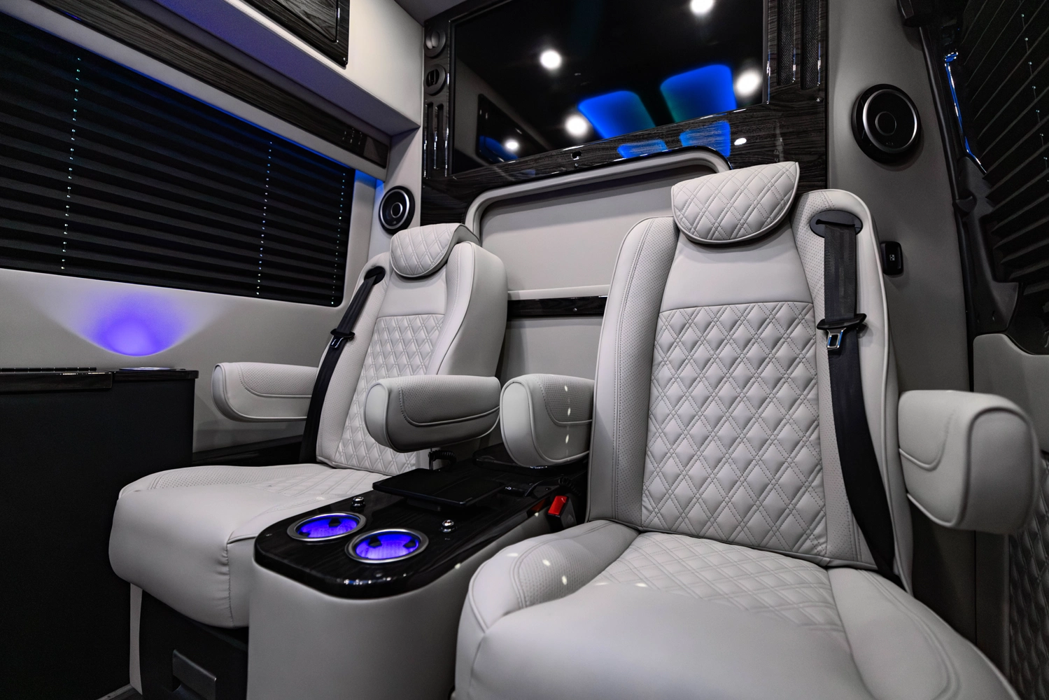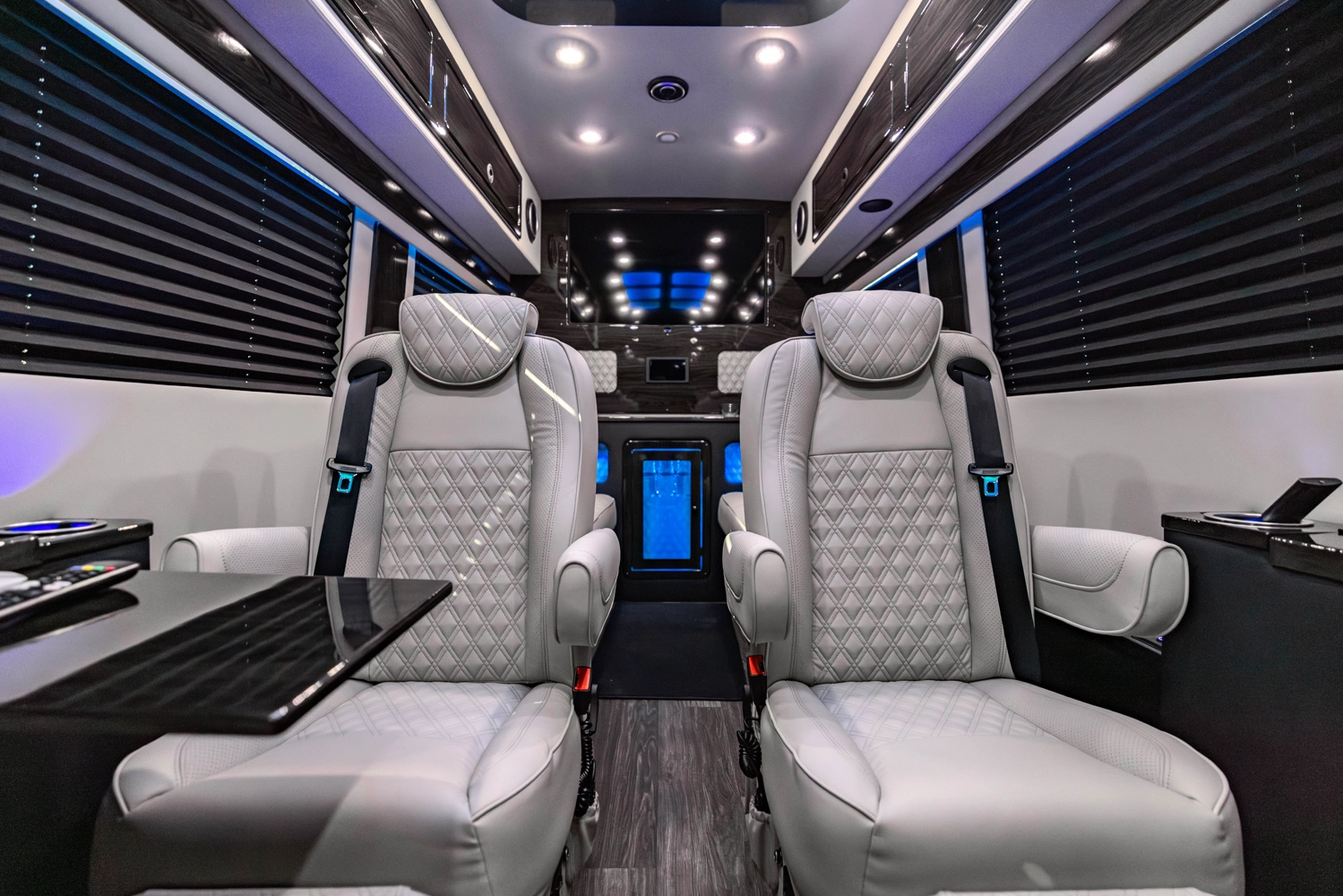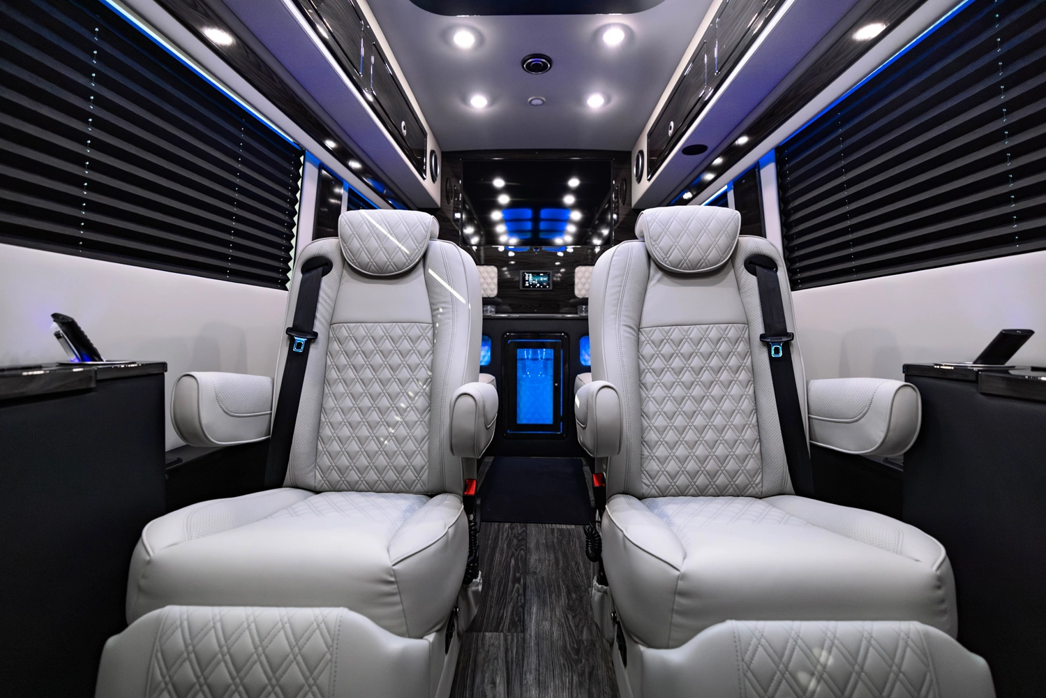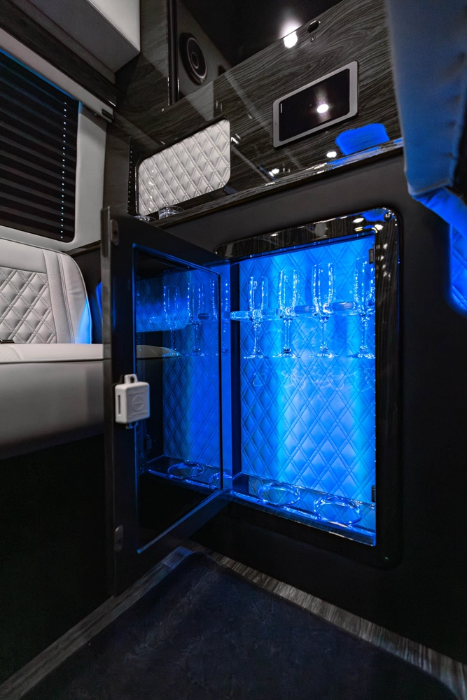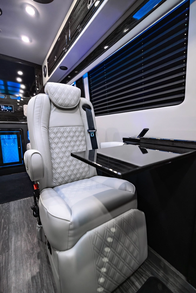 The VDRIVE 10OB redefines executive travel, hosting ten passengers with four handcrafted captain’s chairs and 38" opposing benches. Featuring full partitioning for the driver and co-pilot, this model provides a private environment tailored for elite chauffeur and business events. Superior sound insulation, advanced climate control, and premium entertainment systems complete this pinnacle of luxury transportation.