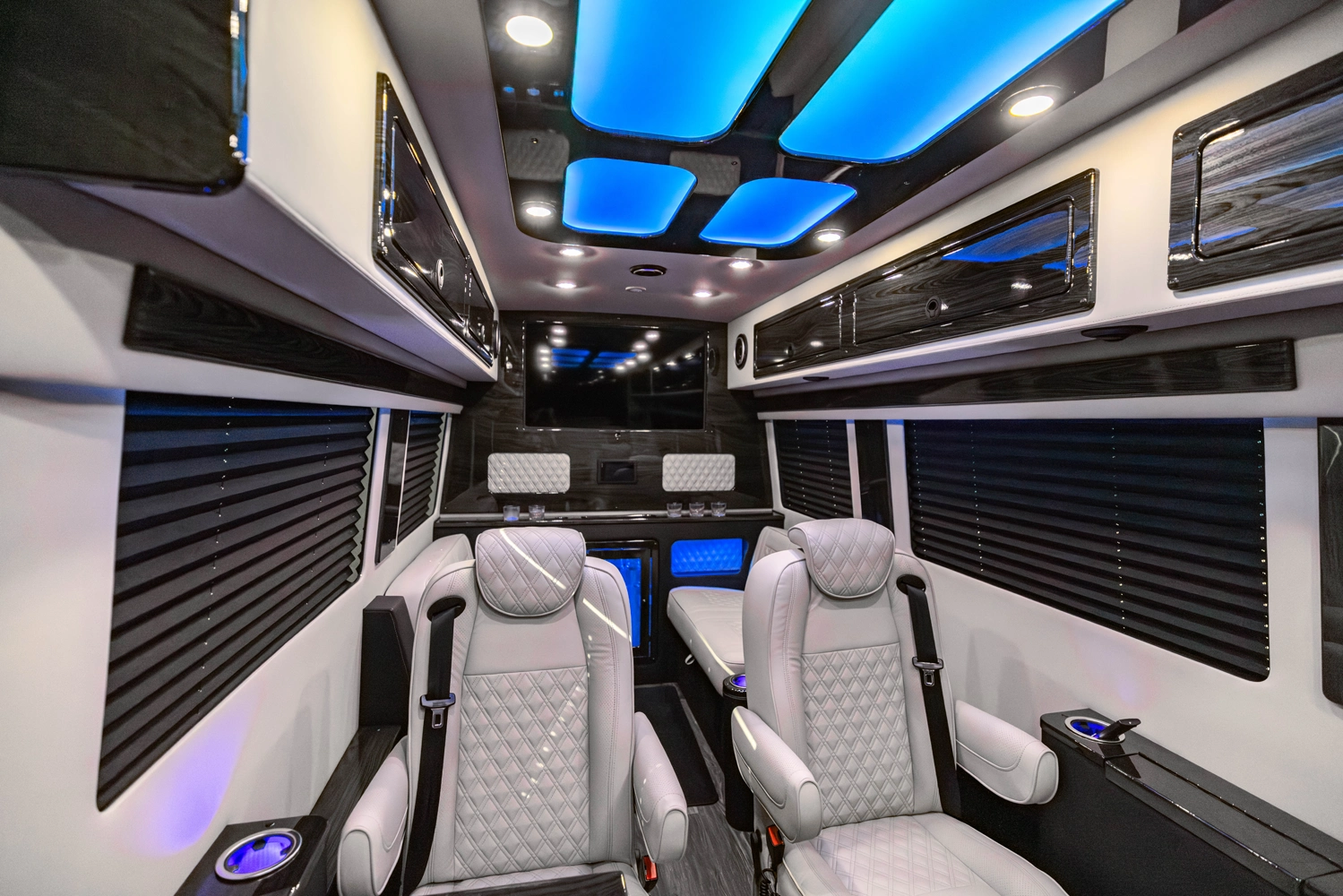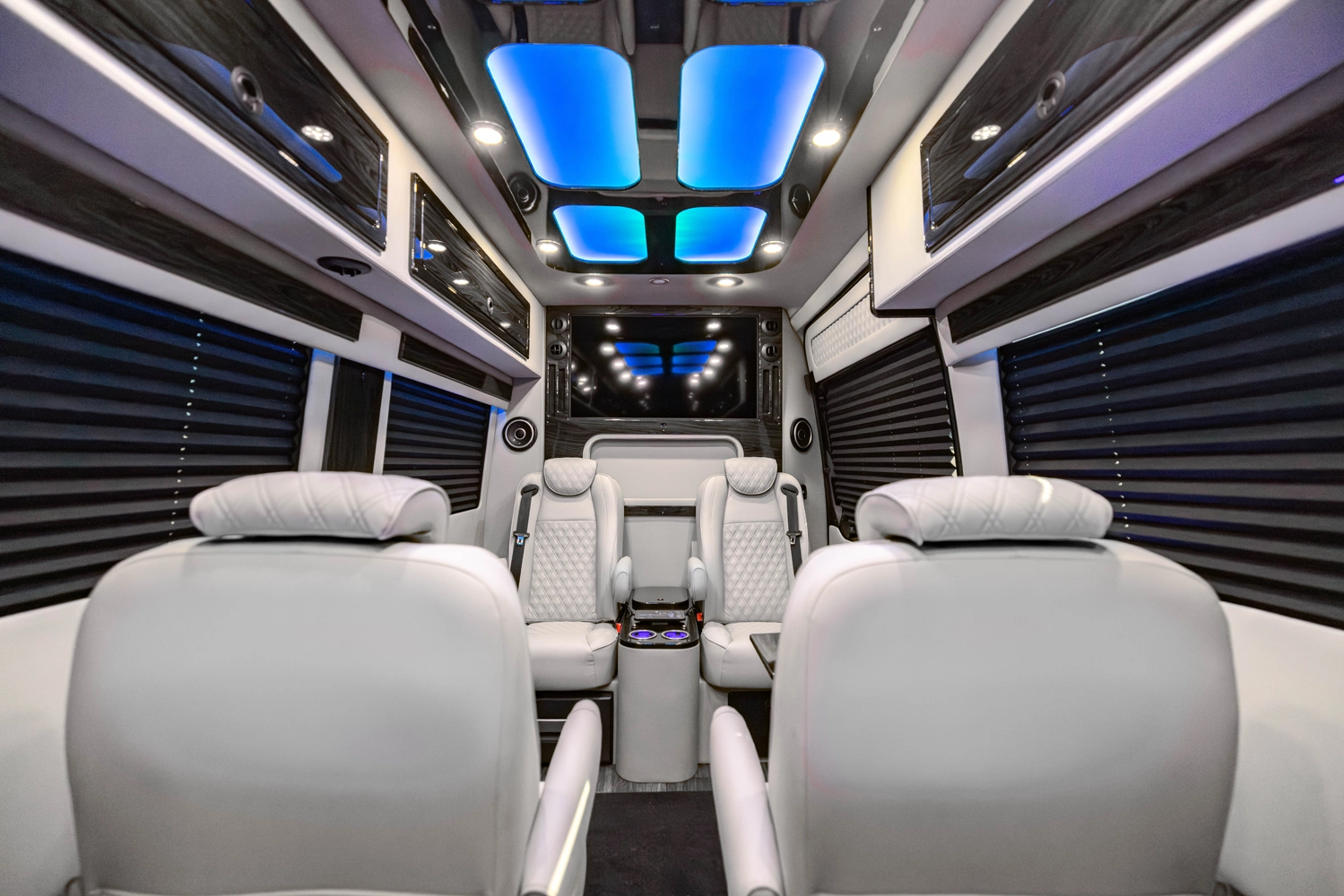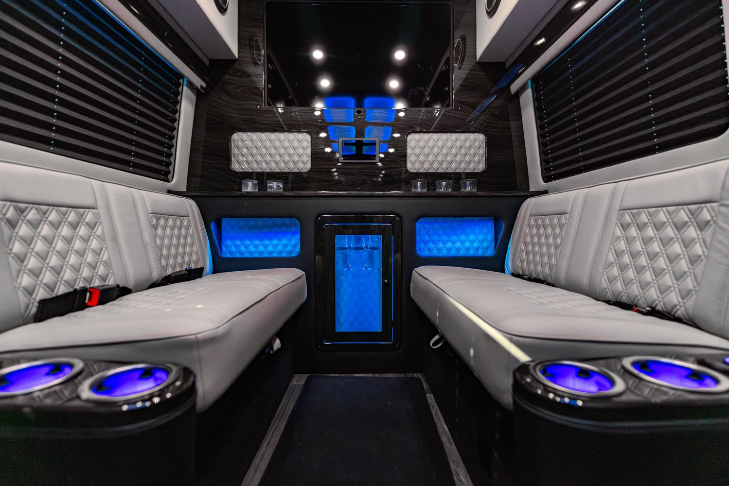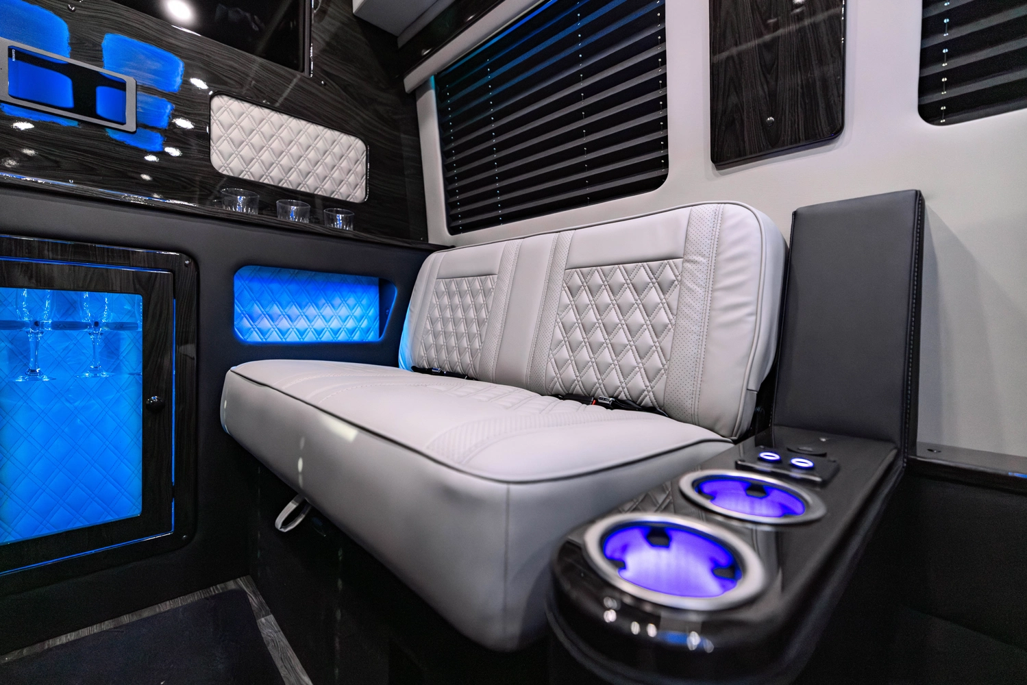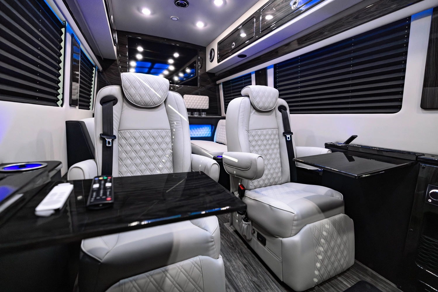 The VDRIVE 10OB redefines executive travel, hosting ten passengers with four handcrafted captain’s chairs and 38" opposing benches. Featuring full partitioning for the driver and co-pilot, this model provides a private environment tailored for elite chauffeur and business events. Superior sound insulation, advanced climate control, and premium entertainment systems complete this pinnacle of luxury transportation.