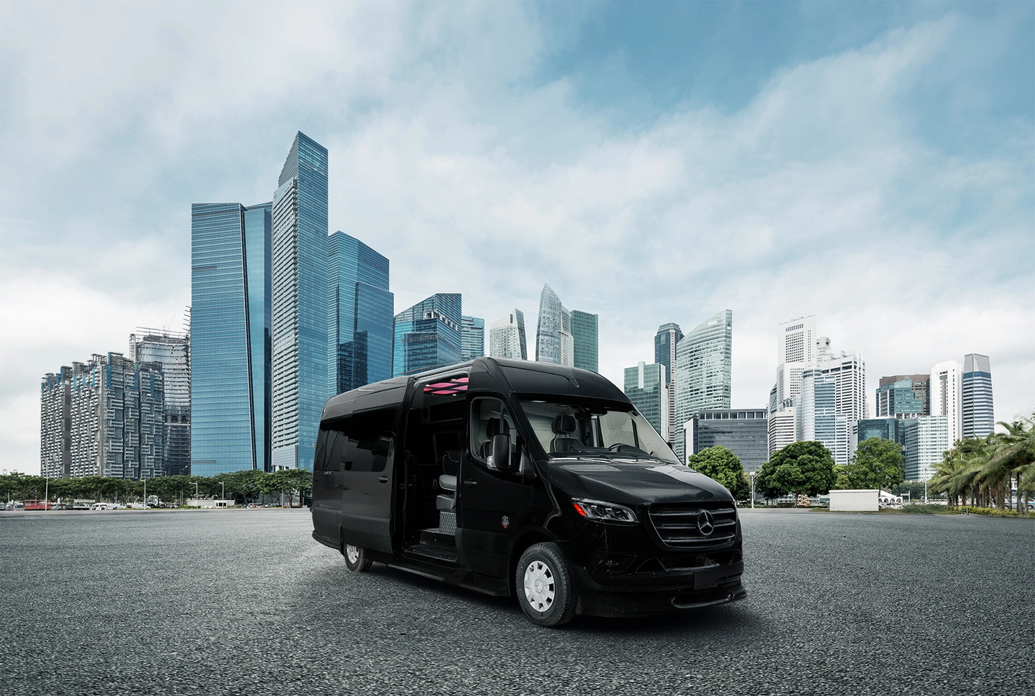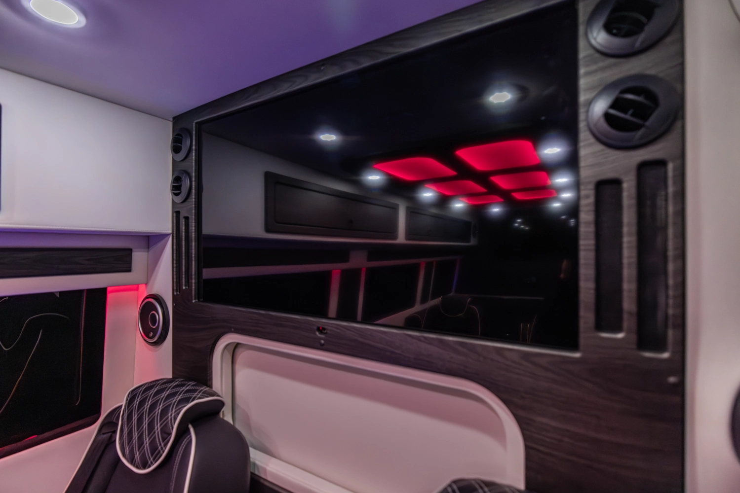 The 10RJ VDRIVE offers an elite sanctuary for ten passengers. A full partition ensures privacy, and the rear cabin features four handcrafted captain’s chairs in club seating and a comfortable rear J-bench. Engineered with superior insulation and advanced entertainment systems, this model is the definitive choice for executive travel.