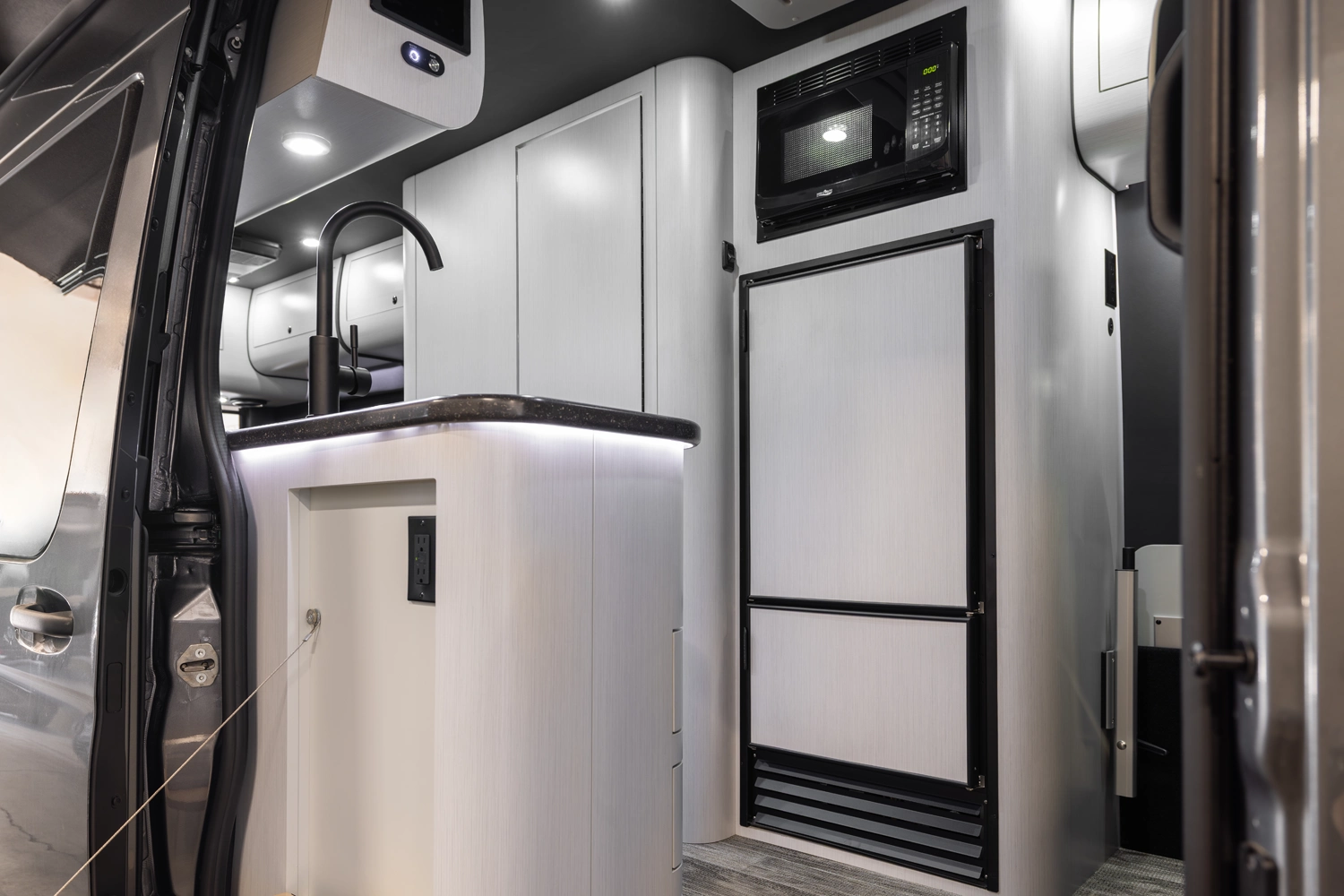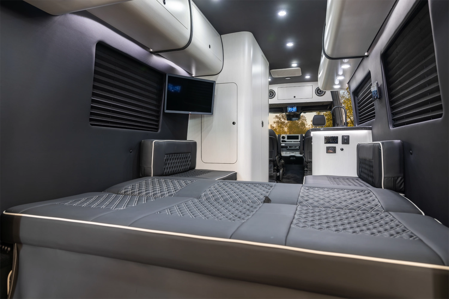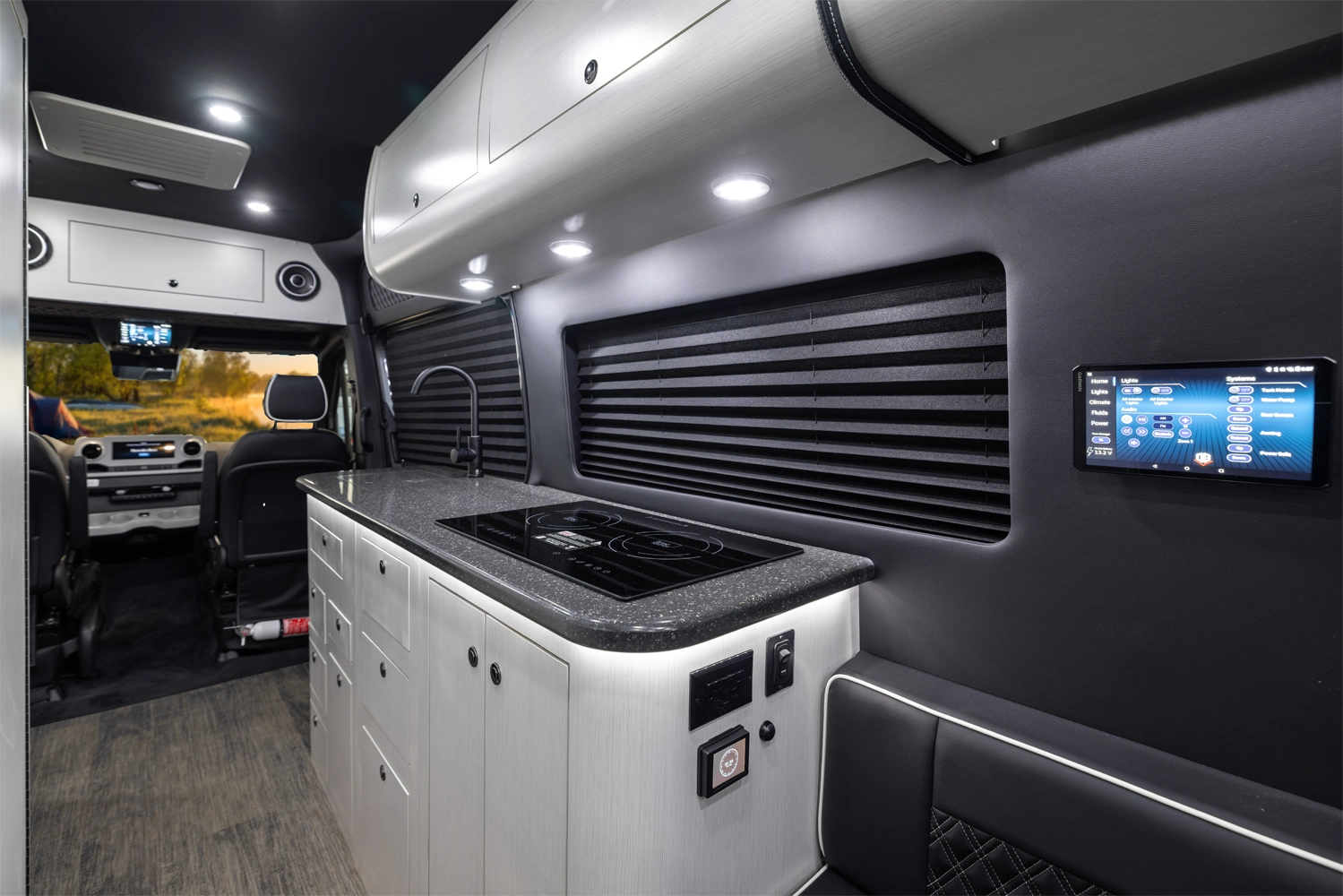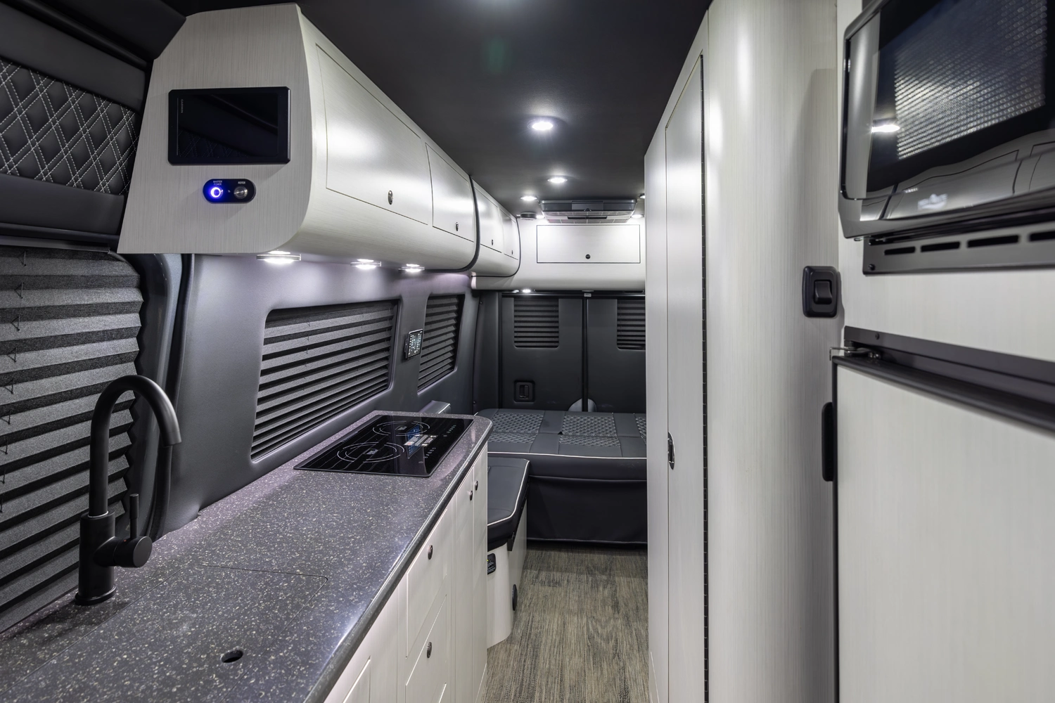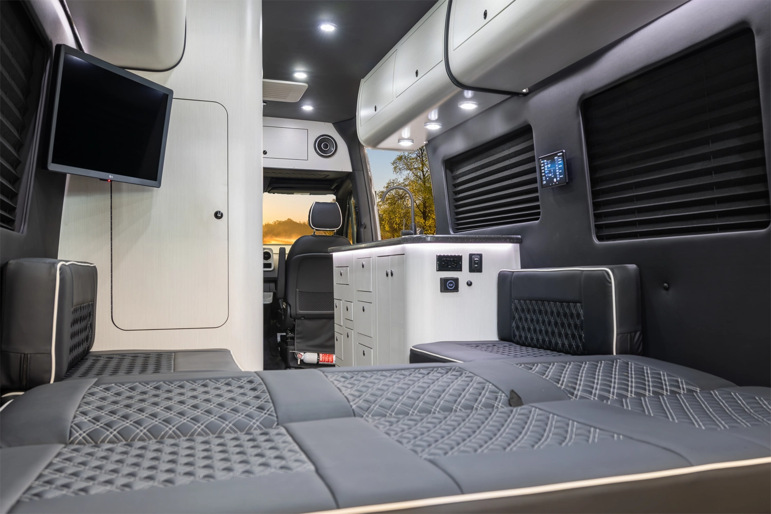 The 5RL delivers refined versatility in a sophisticated 5-passenger layout featuring two handcrafted captain’s chairs, a rear lounge bed, a full driver-side wet bath, and a passenger-side kitchenette. Designed for premium camping comfort, it includes a microwave, cooktop and advanced climate control. The VRV series offers superior sound insulation, state-of-the-art entertainment, and sleek custom full-body paint, combining luxury and design for elevated camping.