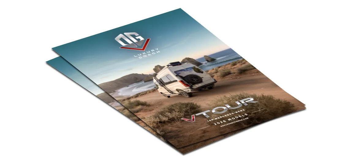 Built for adventure camping on a Mercedes-Benz 144” wheelbase sprinter van. VTOUR models offer a full wet bath, microwave, cooktop and rugged exterior accessories. These luxury adventure vans are complete with handcrafted seating, advanced climate control, superior sound insulation and state-of-the-art entertainment options. #VTOUR